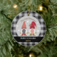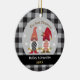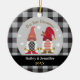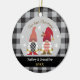 Detta vackra prydnadsföremål har två söta gnomer och snöflingor i vackert svart, rött, guld och vitt färg och en svart och grått buffalo-plätering (guld färg simuleras och har ingen faktisk metallisk guld). Det står "Vår första jul" Punkten kan vara personlig med året och namn på framsidan. Baksidan har en svartvit och grått buffalo plaid-design. Du kan lägga till ett foto i baksidan om du vill.