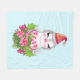 En filt med en söt och vismisk design med en snygg penguin med en röd, grym hatt. Stående bakom en blombukett med rosa och vita stripade polkagrisar.