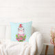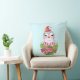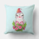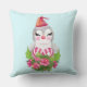 En kudde med en söt och vismisk design med en fin penguin som bär en röd tomhatt. Stående bakom en blombukett med rosa och vita stripade polkagrisar.
