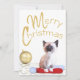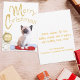 Det här platta julkortet har en berömvärd siamesisk kattunge som står på jultomtens hatt på bord av guld stjärnor och en guld ornament. Guld "God jul"-typografi ligger över designen. Anpassa hälsningen på baksidan i fälten, ta bort antingen eller all malltext som lämnar utrymme för en handskriven anteckning eller klicka på Anpassa för att välja ett typsnitt stil, storlek och färg som du vill ha.