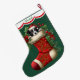 Den här Helgdag har en bild av en vacker svart och vit Gräns Collie-hund som pendlar ut från en ren röd strumpning. Bilden omges av hal, röda bär och poinsettia blomstrar och placeras på en grönt under julen. En vit skalopad kant-design som är kantad av rött håller ditt anpassade namn överst. Lagerhållningens baksida är identisk med framsidan.