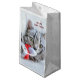 Giftpåsar med ett sött julfoto av en grått tabby katt som spelar en röd julhatt. Hans stora fluffy tassar gör fotot extra härligt.