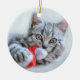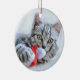 Ornament med ett sött julfoto av en grått tabby katt som spelar en röd julhatt. Hans stora fluffy tassar gör fotot extra härligt.