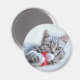 Magnet med ett sött julfoto av ett grått tabby katt som spelar en röd tomhatt. Hans stora fluffy tassar gör fotot extra härligt.