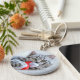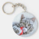 En nyckelkedja med ett sött julfoto av ett grått tabby katt som spelar en röd tomhatt. Hans stora fluffy tass gör fotot extra härligt.