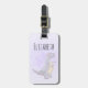 En bagagetagg med en söt illustration med en gråaktig lila-dinosaurie.