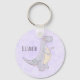 En nyckelring med en söt illustration med en gråaktig lila dinosaurie.