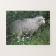 Det här fantastisk-pusslet har ett foto av ett sött fluffigt får. Fåren omges av vild blommor och långgräs och äter giftigt lite löv. Den har en tjockvit jacka av ull och en söt svart näsa.
