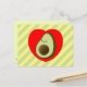 En tecknad stil avokado i ett rött hjärta. Anpassningsbar vykort. Gult och grönt rand i bakgrunden. Allt digitalt teckning.
