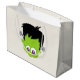 En presentpåse med ett berömvärt frankenstemonster ansikte. Han har stort öga och ett leende med ett ärr över hans förfäder. Klassiska bultar som sticker ut från sidorna av huvudet. Den här killen är söt och inte skrämmande alls. Texten säger: bus eller godis.