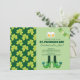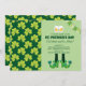 St. Patrick's day party Kallelse med ett mönster som består av klöver. 2 skummande öl mugg och en buntbanderoll. Ett par ben med skor i grönt och schaktmassor.