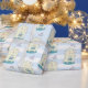 Föråldrad förpackning papper med en söt leende dinosaurer, rosa rosy-kinder och RAWR skriven på hans mage. Tre färgfulla lycklig-stjärnor ovanför hans huvud. Sätt på en ljusblå och vit mönster i polka dots och rand.