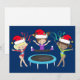 Det här vackra julkortet för gymnastik har tre söta gymnastflickor som bär julhattar och som håller en attityd med rosett band på en söt blå helgdag bakgrund. Blindingen håller ett rött band, brunetten hoppar på en trampolin och den afrikanska amerikanska flickan håller ett grönt band.