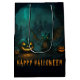 Ta Halloween-magin till firande med den här vismska presentväskan med en söt baby-drake omgiven av jack o lantern-pumpor. Både framsidan och baksidan visar teckningen med festivt meddelande "Happy halloween" som kan anpassas med din egen text eller namn. Perfekt för party favors, bus eller godis, godis eller skokiga säsong-gåvor är denna påse både roligt och fullt av charm.