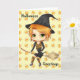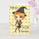 Cute Halloween chibi och hennes svarta kattunge flyger på en bom mot candy corn-bakgrund på ett hälsningskort för din egen text. Anpassade så att du kan ändra texten om du vill.
