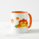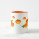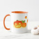 Den här Halloween-temade orange-kombinationen mugg har söta, leende, pumpor i olika storlekar.