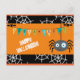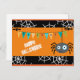 På framsidan av det här Halloween-vykortet i hälsning finns en söt svart spindel som hänger från webben mot en ljus orange bakgrund. På den lämnat sidan finns vit text som kan anpassas. En "Bus eller godis"-banderoll bärs av två svarta fladdermus. Ett svartvitt spindelnät gräns lägger till pooky-intresse. Kortets baksida har en fält för din egen text. Ett billigt och roligt sätt att skicka Halloween-säsongen hälsning! *Clip Art som används i den här designen är upphovsrättsskyddad av Encore Software, Inc., som tillåter använda till licensgivarna. Alla höger reserverade.