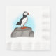 Födelsedag, babydusch eller jubileumsservetter. Digital art hand plockade Puffin står på sten med blå bakgrund.