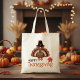 Tote-väskan har en fin kalkon av Thanksgiving på båda sidor. Turkiet ger en pilgrimshatt med ord "Happy thanksgiving" i ett roligt brunt och orange skript med en söt liten löv-accent