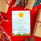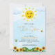 Ett vackert exempel på Sol och trädgård med solblommor och bin och ett vackert blå himmel är inslag som gör detta till en söt könsneutral babydusch i inbjudan.