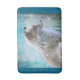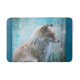 Ett badmatt med ett foto av en söt räv stående ensam. Sätt på en blå grinig bakgrund.