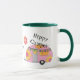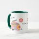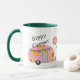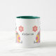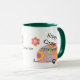 Here's a cute mug, especially for someone who loves their camper! A funny pink camper is decorated with a string banner and bright yellow and gold flower images. The image is printed on two sides of the mug, with the text "Hippy Camper" above each image, but you may easily remove it or change it. Between the images are two graphic flower images, and another text field for your name. This mug will definitely get noticed!