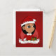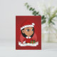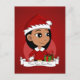 Ett vykort med en illustration av en söt liten latinsk/latinsk liten lycklig som leker latinsk/latinsk eller asiatisk flicka med långt svart hår, som är klädd i julkläder och bär en röd Jultomten-hatt och håller en present; julens helgdagar är utformade på en röd bakgrund, med en redigerbar textmall för ditt namn eller meddelande