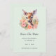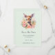 Spara datumkortet med en vacker illustration med en söt hjort. Omgiven av rosa ros och blommor.