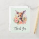 Tack vykort med en vacker illustration med en söt hjort. Omgiven av rosa ros och blommor.