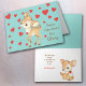 Det här snygga Valentine-hälsningskortet har en liten brun hjort som ser på de många röda hjärtan som flyter runt. Vid hjortens höger är anpassningsbarna i motsvarande bruna text. Bilden och texten placeras på en ljusblå bakgrund. På insidan finns en annan bild av hjorten med mer anpassningsbar fält som du kan ändra, om du vill. Cute efter en förälder eller mor- eller farförälder till ge till ett barn.