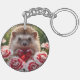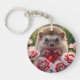 A cute hedgehog holding a red garnet heart sits in a patch of red and white carnations.