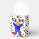 En söt jugglande cirkus clown sitta på en vit pricklåda med ljusa färgader. Idealiskt för barn party, glöm inte att anpassa texten med dina detaljer.