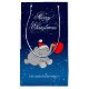Cute elephant med röd hatt och väska med julklappar över blå bakgrund med vit snöflingor