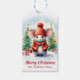 Fira i stil med den söta julmuspresentens märkre. Den här vattenfärgsillustrationen, i glatt färg, har en söt julmus och dekorerat Julgranar. Det är perfektens sätt att ange tonen för en roligt firande och önska dina nära och kära ett God jul.