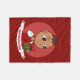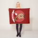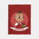 Kasta filt med en illustration av ett sött leende lycklig flicka eller pojke, baby bär röda och vita kläder och håller en present. Med redigerbar textmall för ditt namn eller meddelande, juldesign med röd bakgrund, helgdagar med röd bakgrund