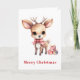 Julkort med en illustration av ett vackert baby-hjort. Stora ögon med stort öron med stort huvud och små bruna antenner. Med en stor röd båge.