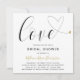 Typografi Inbjudningskort för möhippan med ord, "kärlek" i svart kalligrafi med en guld-hjärtsvikt i slutet, över en vit bakgrund. Namn i den blivande briden är i en matchande skugga av guld. Baksidan är solid svart. Den enkla och minimala layouten och mängden öppet utrymme ge är en modern känsla och kalligrafitexten och hjärtat ge är en romantisk vändning.