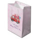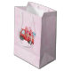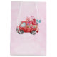 Gråväska med en söt röd vattenfärg lastbil. Bär hjärtan och blommor i ryggen. Jag kärlek u, skriven på sidan. Viktigt och förtjusande. Ljus rosa mönstrad bakgrund.