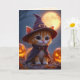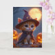 En söt kattunge med en häxkostym för Halloween. Pumpen varierar storlekt och glöd med ett mjukt orange. Bakgrunden är en mysigt nattscen. Söt, anpassningsbar Halloween-kort för alla!