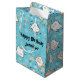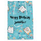 Grattis på födelsedagen-presentväska med en söt katt mönster, med blå bakgrund och med regnbågar och tass avtryck med mera.