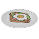 Adorable cartoon character illustration of a piece of breakfast toast topped with lettuce, bacon, and a fried egg where the yolk is a smiling ginger cat face.