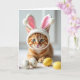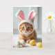 Designed with a youthful ginger-striped cat centered in the scene, the portrait draws you in with bright emerald eyes and a steady, affectionate gaze. A plush white bunny-style hood frames its face, with soft pink-lined ears and tiny pom-poms that add a gentle 🐰 touch. The cat rests on a fluffy white surface, leaning forward slightly as if curious and friendly, like it’s ready to nuzzle up to someone nearby. Behind it, a pale, softly blurred background keeps all attention on the fur’s warm orange pattern and the cozy texture of the costume. Several smooth egg-shaped decorations sit in the foreground, including sunny yellow ones and speckled white ones that suggest a springtime setting 🌷. Light falls softly across the whiskers and nose, giving the face a tender, inviting look, while the ears show careful shading along the pink inner fabric. A short greeting appears near the top in a light pastel color, with smaller matching text placed beneath it for balance. The white hood’s tall ears rise above the cat’s head, their rounded tips capped with fluffy pom-poms.