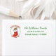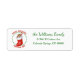 En förtjusande liten kattunge har somnat i en röd och vit julstrumma på denna återvändandeadressetikett för säsong. Den röda texten ovanför och under bilden säger "GOD JUL" och "GOTT NYTT ÅR". Bilden och personligen placeras på en vit bakgrund och informationen är i grönt.