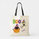 Det här är en söt Halloween-påse för ett barn, med en liten svart kattunge som bär en häxhatt och sitta inuti en jack eller'lantern. Nära kattungen är en grönt uggla på gren, och den stiliserade texten ovan säger BOO i grönt, orange och lila. Vid högerna grund står det i anpassningsbar att det för närvarande står "Happy halloween". Baksidan av väskan har samma bild som ditt barns namn. *Tack vare söt GrafikDesign för bilder som används i den här designen.