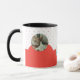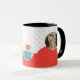 Celebrate your love for feline friends with this adorable custom photo mug! Featuring a charming pattern of tiny red hearts and a stylish red wave, this design includes two photo placeholders to showcase your favorite kittens. Whether it's a gift for a cat lover or a treat for yourself, this high-quality ceramic mug adds a touch of sweetness to every coffee break. Easily personalize with your own photos!