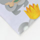 En filt med en illustration av ett sött grått koala som äter lite eukalyptus löv och bär finare golden krona. Ange en ljusare lila digital vattenfärgsbakgrund.