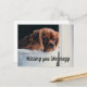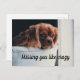 Vykort med foto på en välvillig valp tittar mycket ledsen och ensam. Texten säger: "Saknar dig som galen."