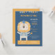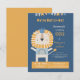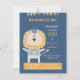 Lustigt lek på ord "Vi är inte på Li-on!"-festinbjudan i mindre storlek för en liten pojkes ettåriga födelsedag med en stolt lejon med en blå krona med en regnskjorta i skuggor av orange-guld och blues med text i matchande färg på mörk blått bakgrund. Baksidan är en underbar guld-orange. Fyll i dina egna uppgifter i den fält som tillhandahålls.