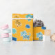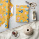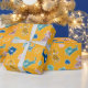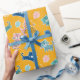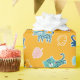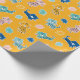 Spädda små lycklig-färgade leoparder med djungel blad på senapsbakgrunden till gulten. Leopard är koboltblått, ljusblått, rosa, teal och senap.