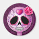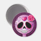 Denna ätliga lila sockerskalle dekoreras med stamvirveler och droppar med stort hjärta mitten i förhuven. Ett enda rosa ros sitter på sidan av det runda skallen precis ovanför det stora svarta ögon. Våldsamma blompedaler runt ögon och munnen har syskon som bildar deras väg upp på kindsidan. Skallen sitter ovanpå en djup lila bakgrund som skapar en vacker kontrast. Den här magnetdesignen är ett lysande exempel på den här Day of the dead-symbolen.